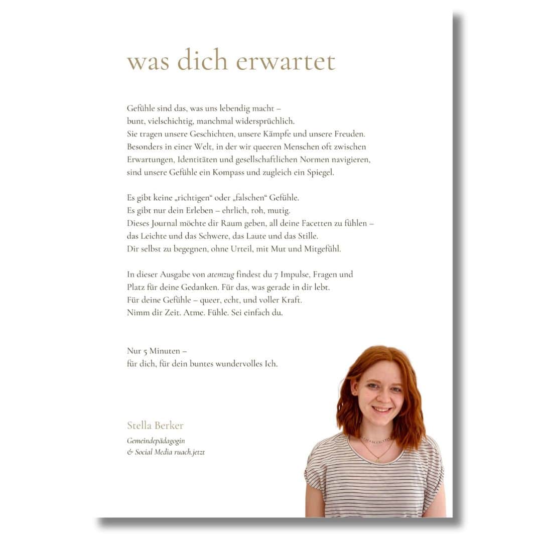 „atemzug – queer bei mir“ lädt dich ein, dich und deine Gefühle anzunehmen. Nicht mit großen Schritten, sondern in kleinen, achtsamen Momenten. Du brauchst keine perfekte Routine. Kein Vorwissen. Nur 5 Minuten pro Tag – und die Bereitschaft, einen Atemzug lang bei dir zu sein.
